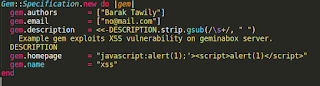 Malicious attacker create GEM file with crafted homepage value (gem.homepage in .gemspec file) includes XSS payload as the following image: